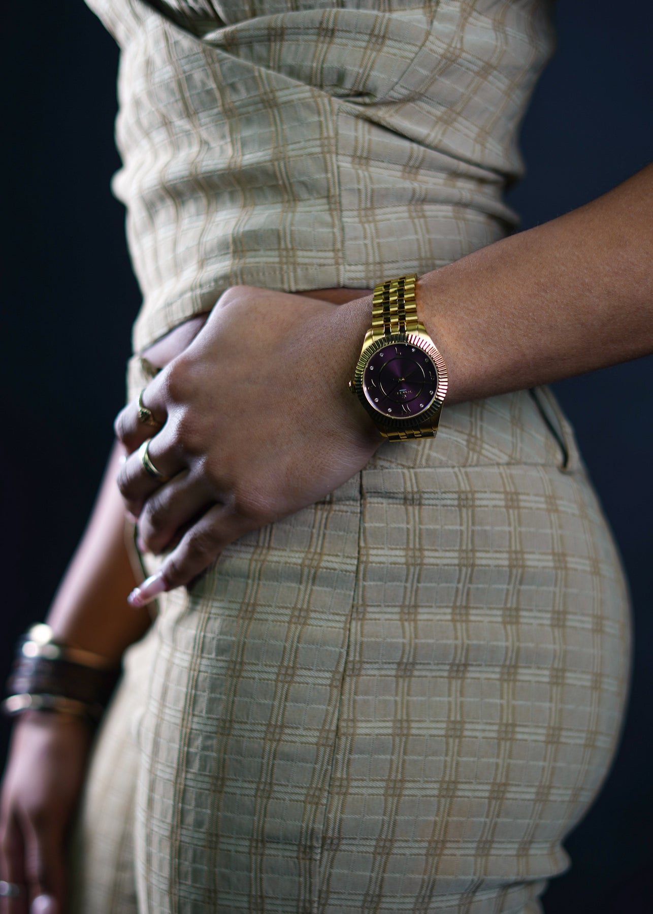 Where elegance meets intrigue. Royal Mirage is inspired by the quiet confidence of a woman who holds her own story close. The rich purple dial, golden frame, and sparkling details create a majestic presence.