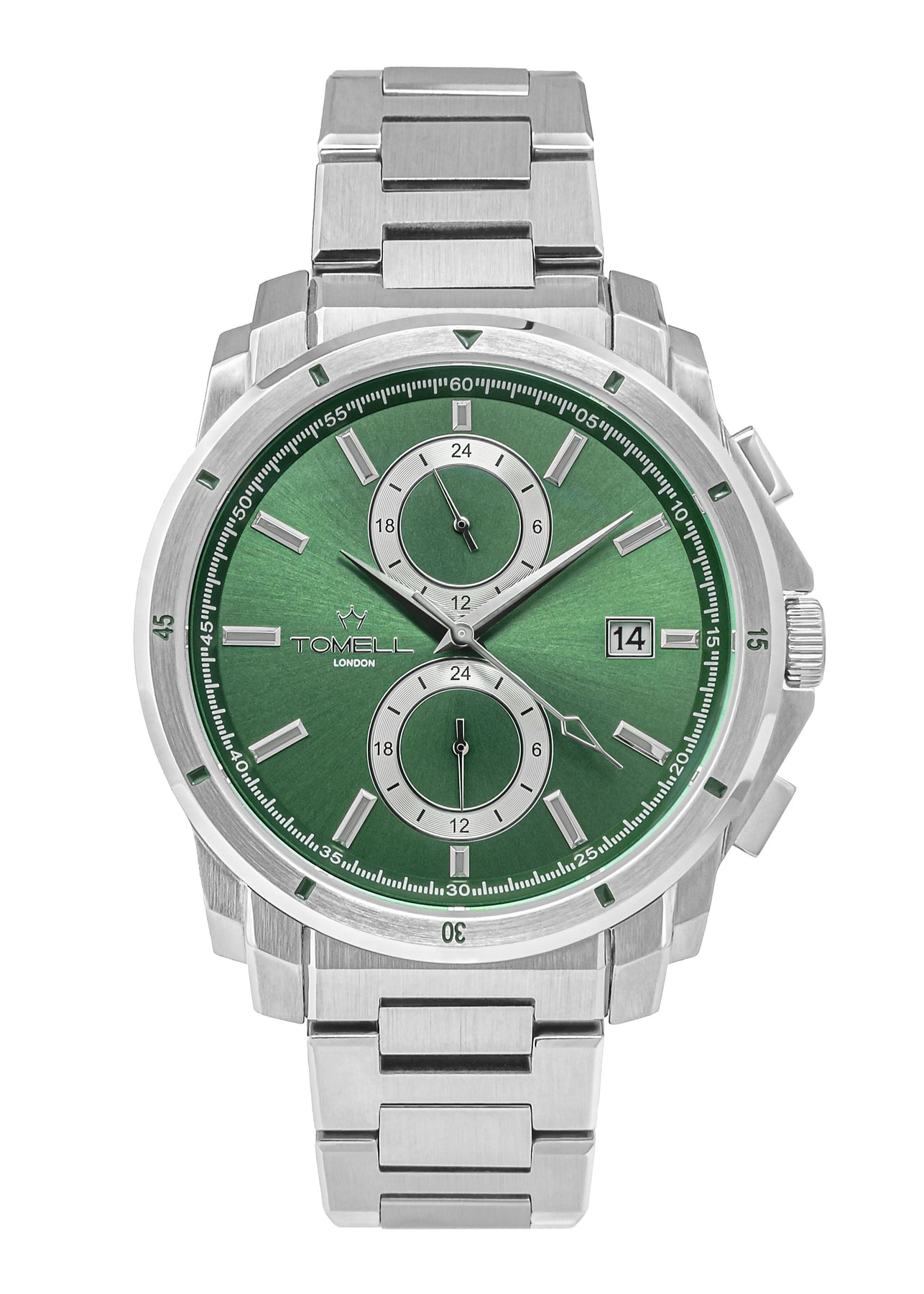 Time reborn in green brilliance. The Prestige Chronos Verde redefines modern prestige with its striking green dial and polished silver case. Bold yet refined, the vibrant green symbolises vitality, individuality, and timeless style. Every chronograph detail is engineered with purpose uniting technical mastery with bold design. This watch belongs to the Prestige Collection, created to commemorate Tomell London’s award-winning journey and our pursuit of timeless excellence. More than a chronograph, the Verde is an expression of confidence, renewal, and enduring prestige.